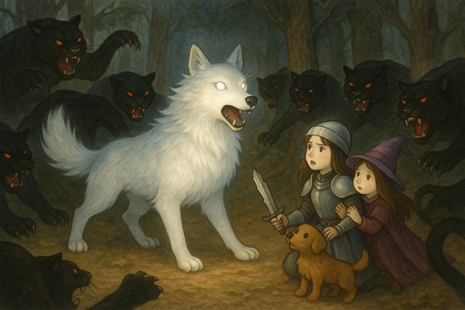 그때, 포실이가 앞으로 나섰어요. 갈색 털이 빛나더니 순식간에 흰빛으로 물들었고, 포실이는 점점 커지며 은빛 늑대로 변했어요. 그의 눈에서는 밝은 광채가 흘러나와 숲 전체를 환하게 비추었지요. 은빛 늑대가 된 포실이는 크게 울부짖으며 검은 호랑이 무리에게 뛰어들었어요.