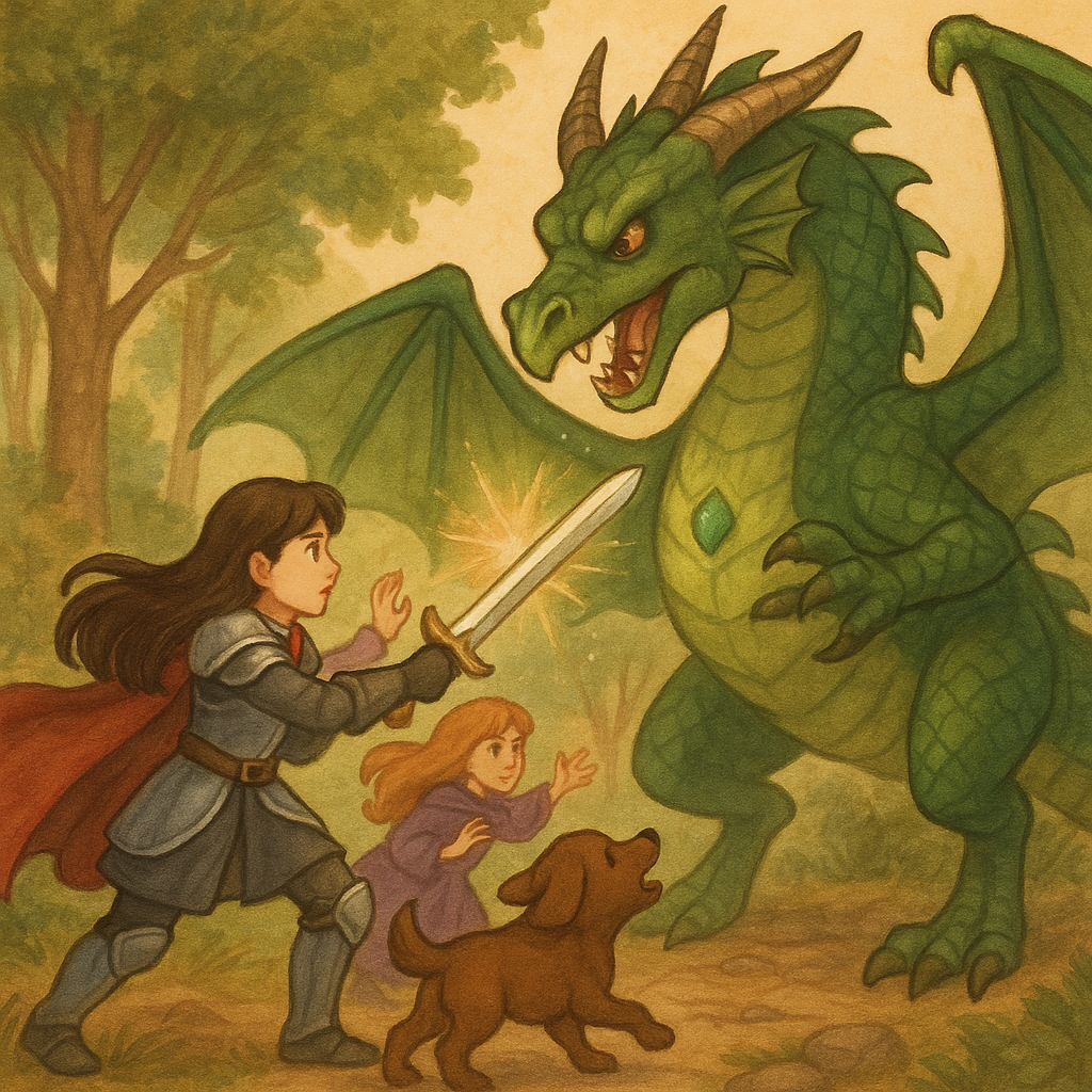 포실은 용감하게 드래곤의 다리에 달려들어 움직임을 늦췄고, 지니는 눈부신 섬광 마법을 펼쳐 드래곤의 시선을 막았어요. 그 순간 아이린은 힘껏 뛰어올라 황금검을 번쩍 들어 빛나는 초록 비늘을 찔러 넣었지요.