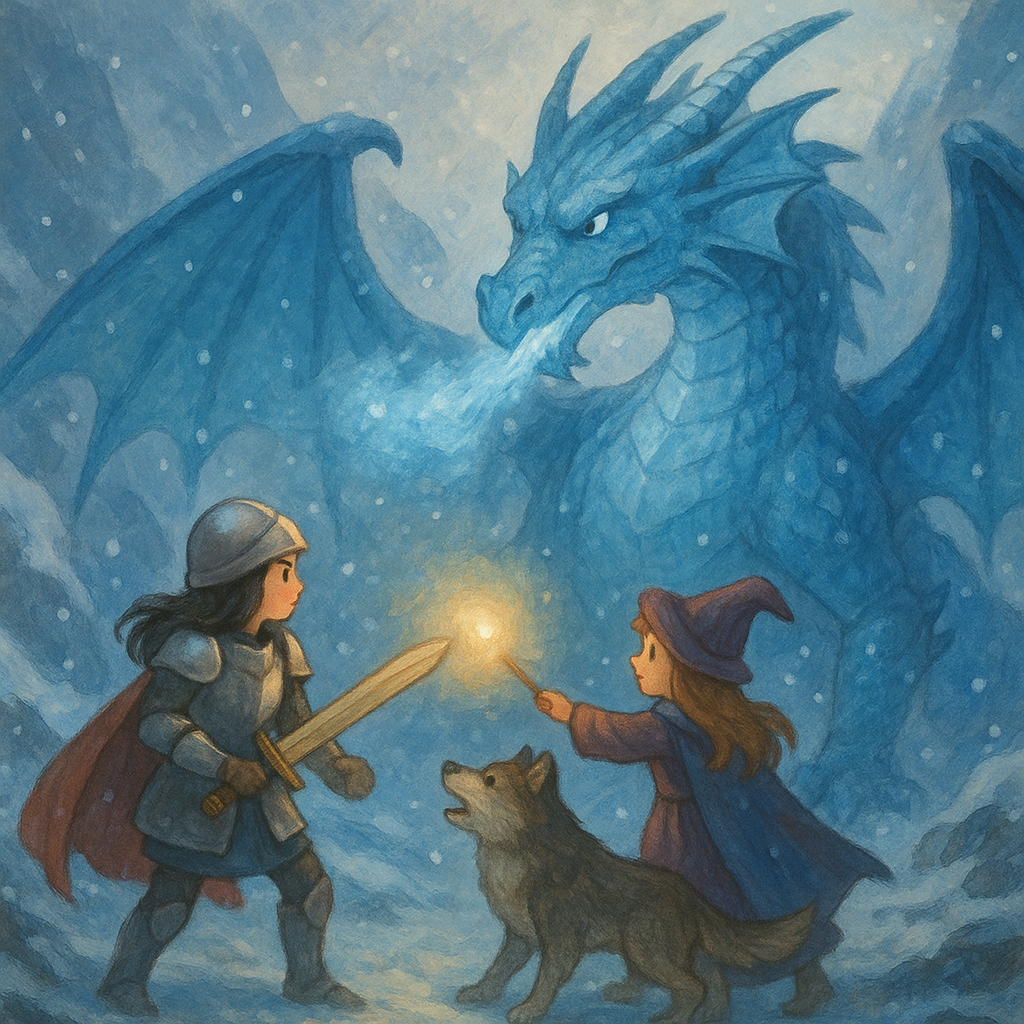 “너희의 용기와 지혜가 이 추위를 녹였다…” 블루 드래곤은 마지막 말을 남기며 눈보라 속으로 사라졌어요. 그 자리에는 맑은 하늘빛으로 반짝이는 사파이어 보석 하나가 남았지요.