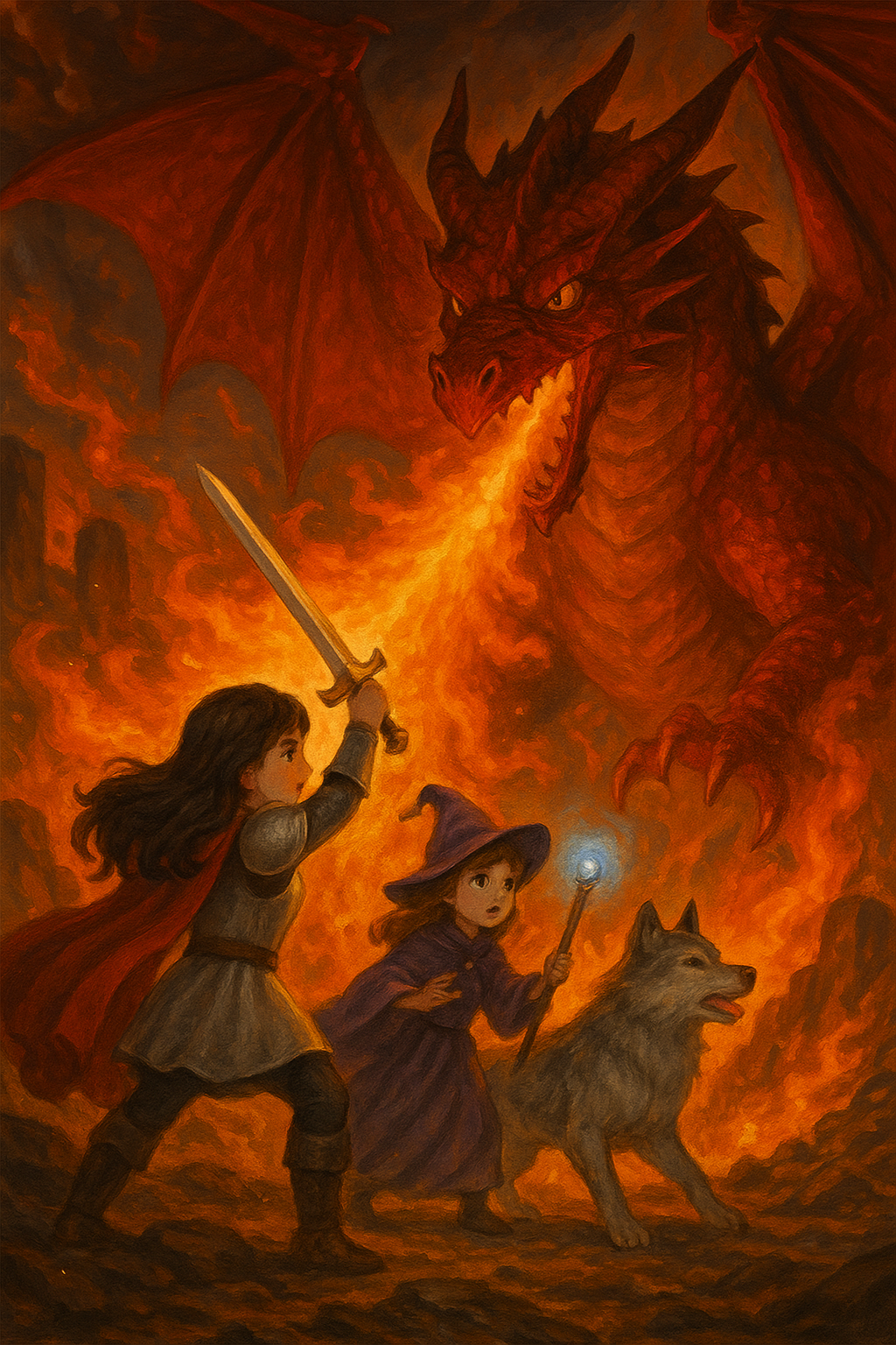 드래곤은 입을 크게 벌리며 불길을 토해냈어요. 아이린은 황금검으로 막아냈지만 검조차 빨갛게 달아올랐어요. 지니의 얼음 마법은 불길에 순식간에 녹아 사라졌고, 포실은 뜨거운 바위 위를 달리며 간신히 몸을 지켰지요.