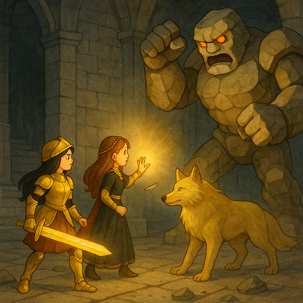 그러나 미궁의 마지막에는 거대한 돌 골렘이 길을 막고 있었어요. 골렘은 두 눈에서 붉은 빛을 내뿜으며 우렁찬 발걸음을 내디뎠고, 거대한 주먹을 내리칠 때마다 땅이 울려 퍼졌어요. 아이린은 황금검으로 막아냈지만 충격이 너무 커서 몸이 휘청거렸지요. 지니는 얼음과 번개의 마법을 시도했으나 골렘의 바위 몸은 꿈쩍도 하지 않았어요. 포실은 힘껏 달려들어 골렘의 다리를 물었지만, 골렘은 발을 구르며 포실을 땅바닥으로 밀쳐냈어요.